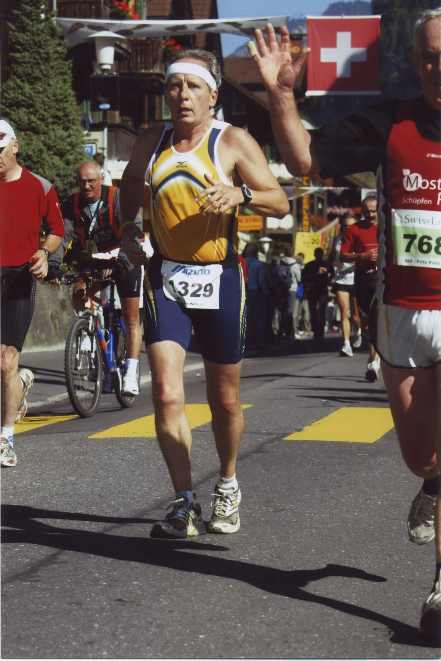 Ook op zaterdagochtend scheen de zon al op de Jungfrau-top, die we vanuit onze hotelkamer zagen schitteren. Het was niet warm, ideaal om te lopen. Nadat het startpistool door een parachutist bij de start was afgeleverd, klonk korte tijd later exact om 9:00 uur plaatselijke tijd het startschot. Na een plaatselijke ronde keerden we nog even terug bij de start, waarna we richting Böningen werden gedirigeerd. Overal werden we volop getrakteerd door veel publiek, muziek en koebellen.