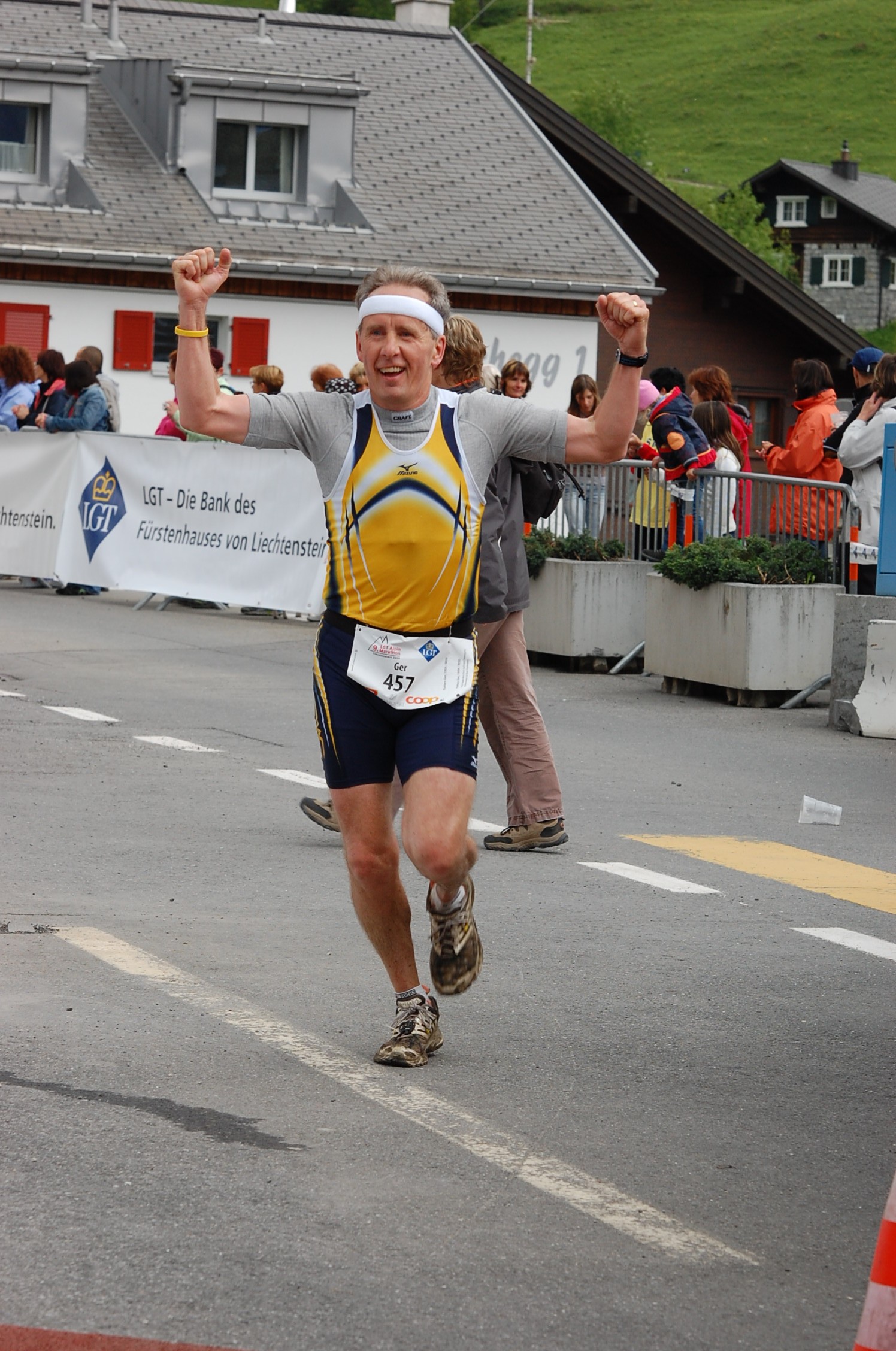 Nadat we de bagage op onze kamer hadden gezet, reden wij weer terug naar het dal, waar we vandaan kwamen. Bij een grote vleesfabriek in Bendern in de buurt van Vaduz moesten we het startnummer afhalen. Hier viel meteen op, dat de organisatie niet zo groots was opgezet dan bij de Jungfrau Marathon of de Zermatt Marathon, maar het gaf wel gelijk een warm familiair gevoel.