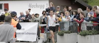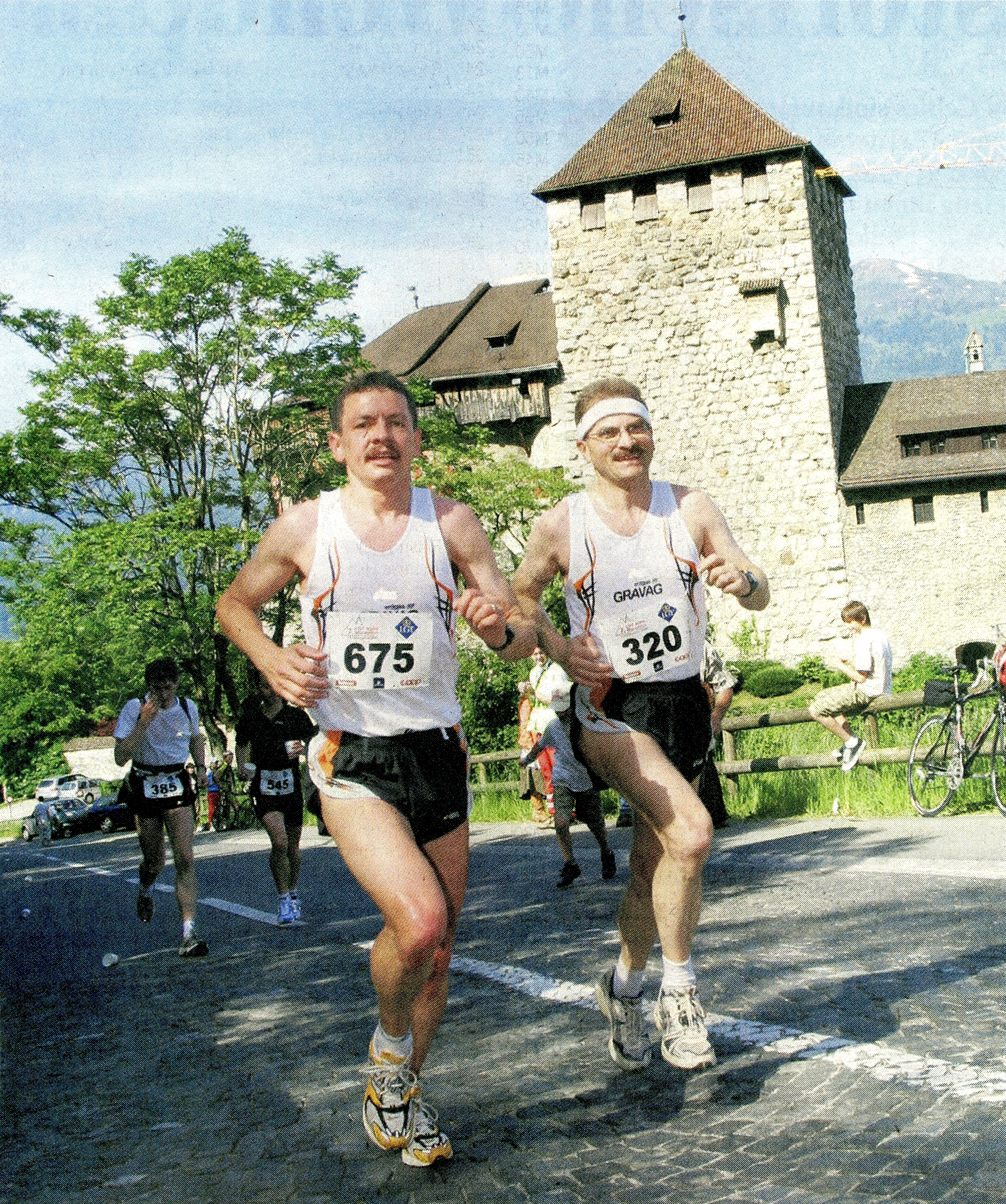 Nadat we het nationale voetbalstadion van Liechtenstein waren gepasseerd, liepen we de stadskern van Vaduz in, waar onze tweede drankpost stond opgesteld. We liepen over de promenade, waar we door het winkelend publiek werden toegejuicht. Na de tijdmeting op 10,5 km. van de start begon het klimwerk richting Steg, een klein plaatsje op 1300 meter hoogte. Voordat wij echter de bebouwde kom van Vaduz verlieten, liepen we nog langs het kasteel van de vorst van Liechtenstein. Hier vandaan kon hij over Vaduz en het mooie Rijndal kijken. Wij lopers moesten echter doorlopen en de beklimming vervolgen. De stijgingen waren niet zo heftig als bij de Jungfrau Marathon, maar in Steg hadden de meeste lopers toch al een aantal malen gewandeld.
